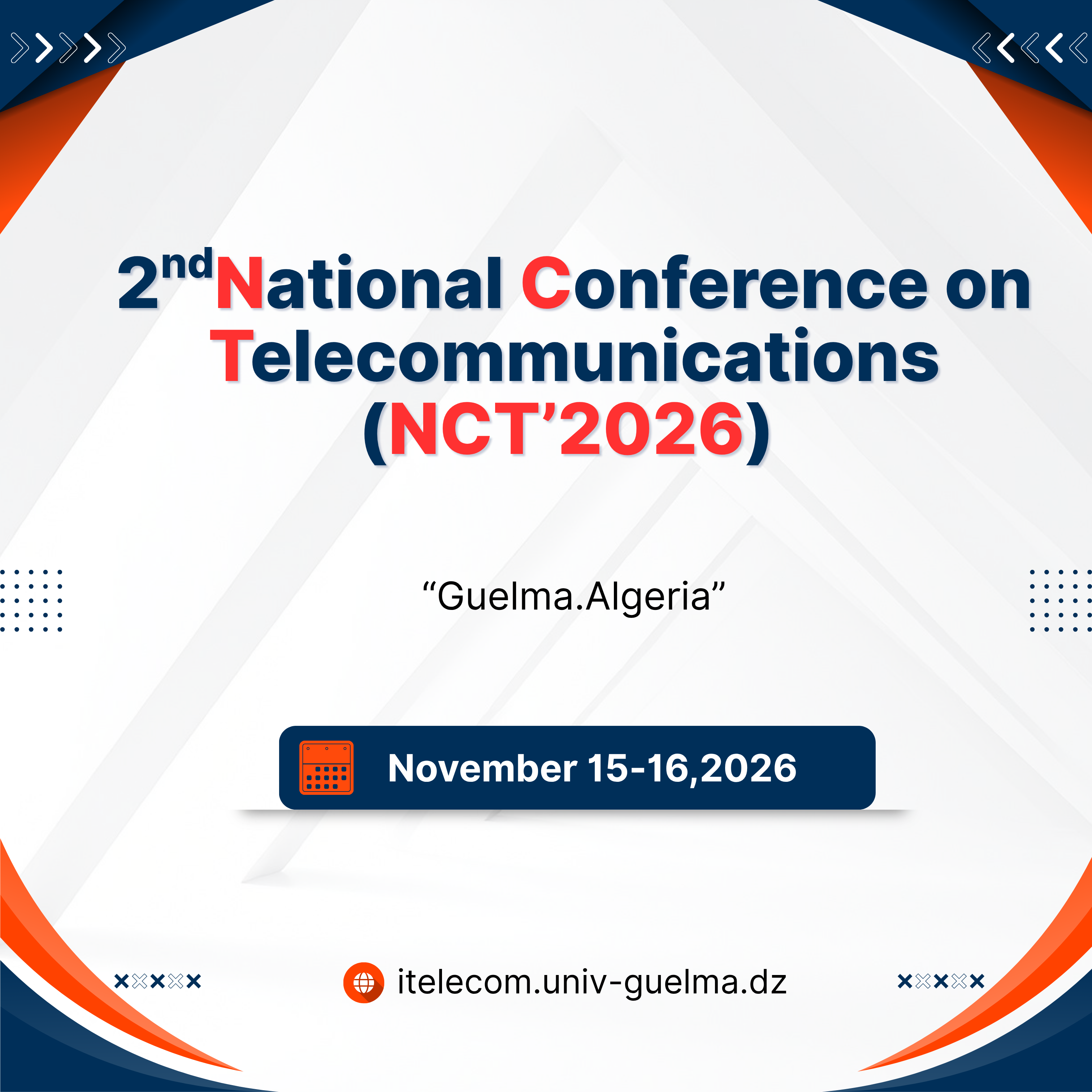 باسم اللجنة المنظمة، يسعدنا جداً أن نرحب بكم في الطبعة الثانية للندوة الوطنية حول الاتصالات السلكية واللاسلكية (NCT'2026)، والتي ستنعقد فعالياتها يومي 15 و16 نوفمبر 2026 برحاب جامعة 8 ماي 1945 قالمة.